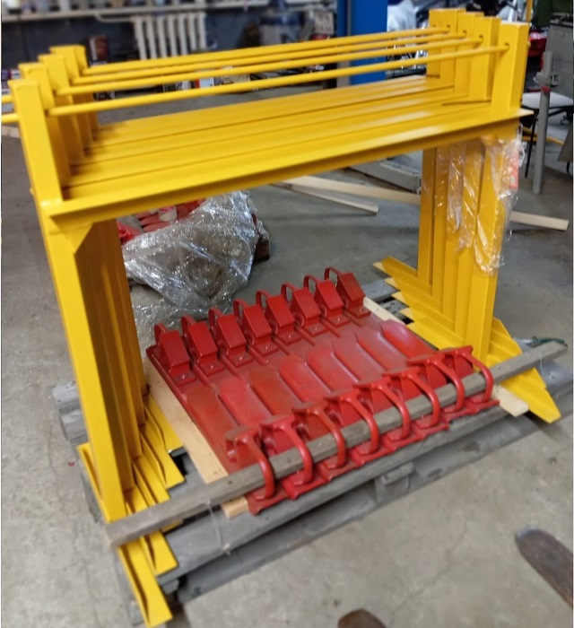Стеллаж для хранения тормозных горочных башмаков станционный предназначен для установки стеллажа в между путями в максимальном приближенни к месту, где производится закрепление состава тормозными башмаками. Стеллаж закапывается в грунт, дополнительно бетонируется, для большей устойчивости. Подвижная штанга закрывается на навесной водонепроницаемый замок, что обеспечивает сохранность башмаков.